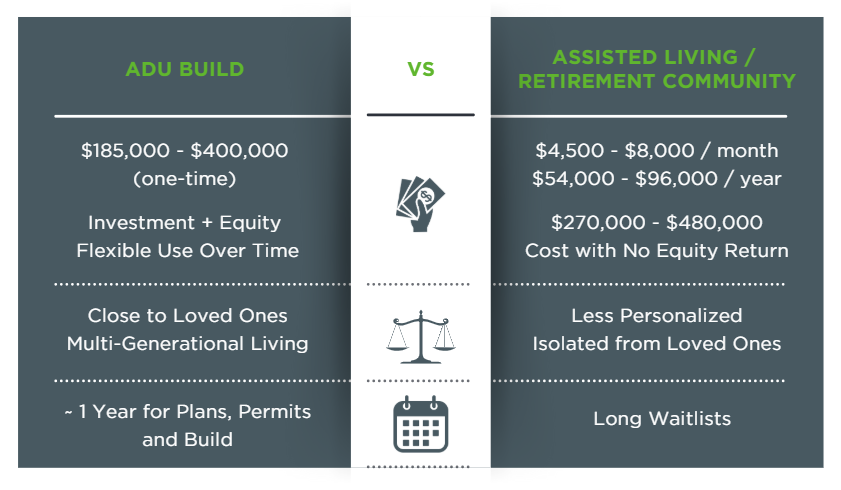 Compared to the high and rising costs of assisted living or retirement communities, ADUs can be a cost-effective long-term investment that adds value to your property. (see the comparison chart below).