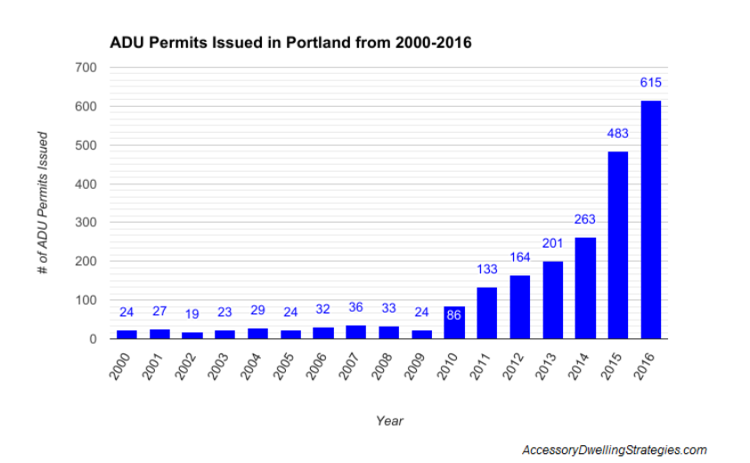 As you can see from the above graph, provided by AccessoryDwellingStrategies.com, the most dramatic shift in the Portland market began in 2010, when the City Council took steps to encourage development and expand the housing supply. By waiving System Development Charges (SDCs) assessed to ADU permits, they significantly reduced the costs of building in the City of Portland by as much as $24,000 in fees.